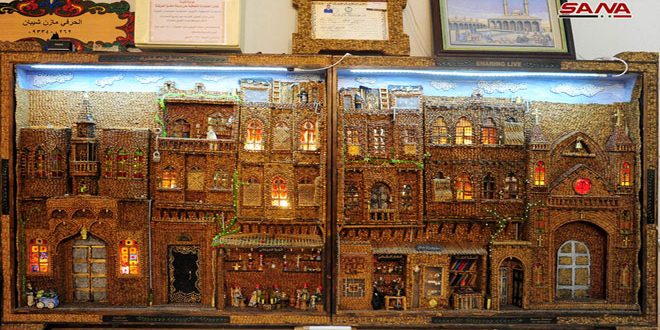في جناح الحرف اليدوية بمعرض دمشق الدولي يقف الفنان والحرفي مازن شيبان أمام لوحة مدهشة تمثل عدة مراحل من تاريخ دمشق مادتها بذور الزيتون ضمن أسلوب فن العمارة الدمشقي الذي تدلنا عليه الأبواب المنحنية والخطوط المائلة أو نصف الدائرية أو المدببة حسب المرحلة التاريخية التي يرمز لها الحرفي شيبان والذي يسعى لدخول موسوعة غينيس بعد استخدامه 94 ألف حبة من بذور الزيتون.