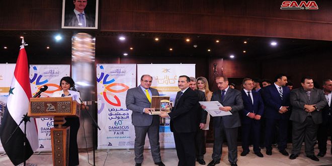 ضمن نشاطات معرض دمشق الدولي بدورته الستين كرمت اليوم المؤسسة العامة للمعارض والأسواق الدولية بالتعاون مع شركة إبداع للاستثمارات في حفل أقامته بمركز رجال الأعمال ممثلين عن 27 دولة مشاركة في المعرض إلى جانب 91 ممثلا عن الوزارات والاتحادات والشركات المحلية والراعية للمعرض.