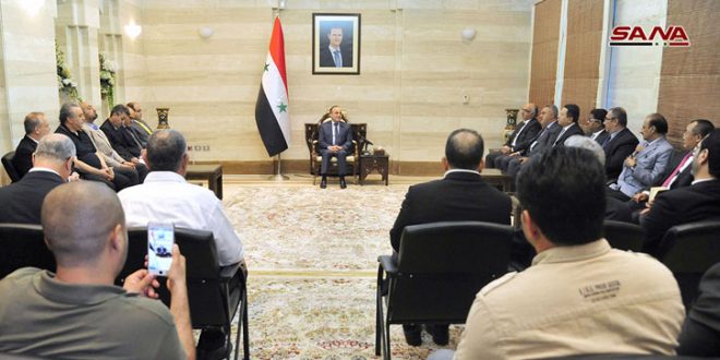 التقى رئيس مجلس الوزراء المهندس عماد خميس اليوم عدداً من ممثلي الشركات ورجال الأعمال المشاركين في الدورة الحالية لمعرض دمشق الدولي من الدول العربية والأجنبية ويمثلون القطاعين العام والخاص.