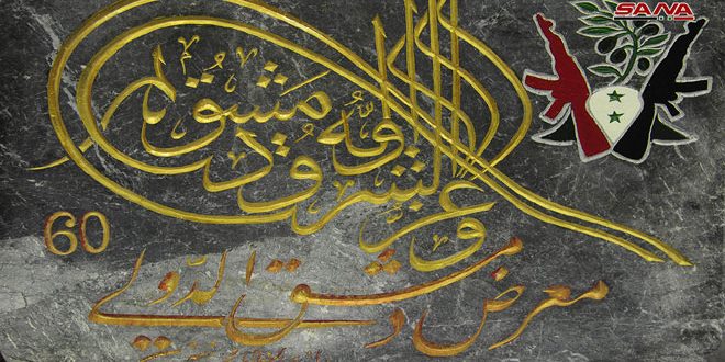 الفنان الخطاط محسن زينة حفر على لوحة من الرخام شعار المعرض “وعز الشرق أوله دمشق” المقتبس من قصيدة الشاعر أحمد شوقي كما نحت في جانب اللوحة الرخامية صورة رمزية مؤلفة من بندقيتين وخوذة ترمز للجيش العربي السوري وإلى العلم السوري وغصن الزيتون ليرمز إلى معاني القوة والسلام في وقت واحد.