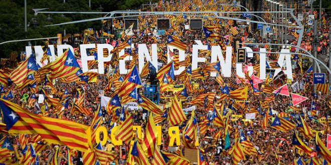 ونقلت وكالة الصحافة الفرنسية عن الشرطة الإسبانية قولها اليوم إن “المتظاهرين ارتدوا قمصانا قطنية حمراء ولوحوا بأعلام انفصالية” في المظاهرة التي نظمت بمناسبة “اليوم الوطني لكتالونيا” التي يتم فيها إحياء ذكرى سيطرة قوات الملك فيليبي الخامس على برشلونة في الـ 11 من أيلول عام 1714.
