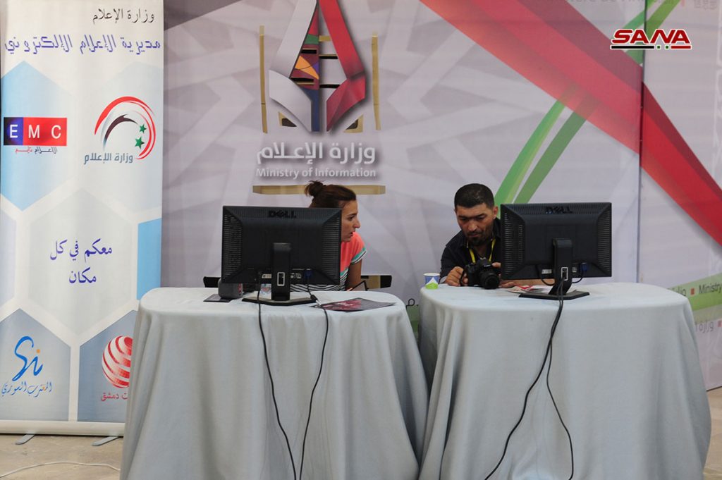 ونقلت وكالة الأنباء العربية السورية سانا بشكل جزئي كلا من قسم الأخبار الداخلية ودائرة التصوير والمونتاج فيها إلى المركز الإعلامي في المعرض لتغطية الكم الكبير المطلوب خلال هذه الفترة من الفعاليات والتقارير وفق أمين التحرير في الوكالة هيثم حسن الذي أوضح آلية العمل المتكاملة بين كوادر الوكالة بمختلف اختصاصاتهم لإصدار الخبر بشكله النهائي من أرض مدينة المعارض مباشرة مضيفاً: “سانا مخدم أساسي لكل وسائل الاعلام بأخبار المعرض وهذا ما لمسناه خلال تواصلنا مع زملائنا الإعلاميين في وسائل الإعلام الأخرى”.