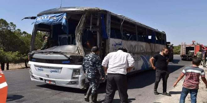 توفي 7 مواطنين وأصيب 24 آخرون جراء انقلاب حافلة لنقل الركاب قرب جسر قرية شنشار على طريق حمص-دمشق.
