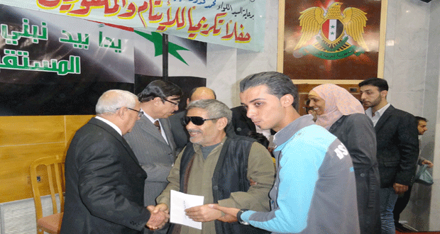 وعبر الكفيفان أحمد الحمد وايمان الصليف من جمعية رعاية وتأهيل المكفوفين بدير الزور عن سعادتهما بالتكريم الذي منحهما شعورا بأنهما جزء من المجتمع ولهما حقوق وواجبات بينما أعربت الطفلة اليتيمة رحمة الشاهر من جمعية البر والخدمات الاجتماعية عن شكرها للمساعدات التي تقدمها الجهات المعنية والتي تخفف من الأعباء المادية على أسرتها.