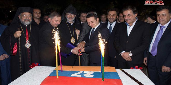 وأوضح القس هارتيون سليميان رئيس طائفة الأرمن البروتستانت في سورية أنه بمناسبة استقلال جمهورية أرمينيا يجب أن تكون التهنئة لسورية الحبيبة كونها البيت والوطن الذي أحتضن أبناء الشعب الأرميني أثناء المجازر العثمانية التي ارتكبت بحقهم وقال “نحن سوريون من أصول أرمينية نهنئ بعضنا بهذه المناسبة لنؤكد أمنياتنا بتوحيد كامل الجغرافيا السورية آملين أن تتحرر من أيادي الإرهاب الغادرة ويعم الفرح على الجميع”.