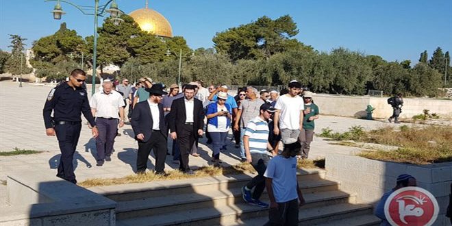 وذكر مراسل سانا أن مئات المستوطنين اقتحموا المسجد الأقصى من جهة باب المغاربة ونفذوا جولات استفزازية في باحاته وسط حراسة مشددة من قوات الاحتلال.