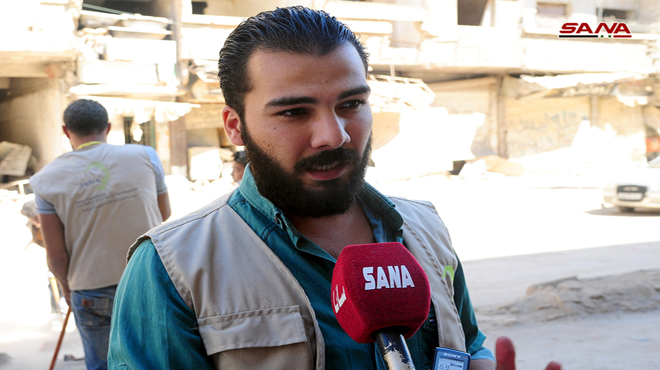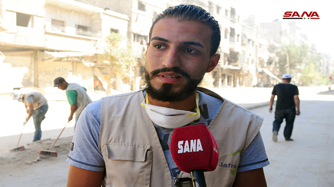 البدء بترحيل الأنقاض من المخيم دفع عشرات الشبان الفلسطينيين للمبادرة والمساهمة في العملية ويقول محمد عودة مسؤول الإغاثة في مؤسسة جفرا للإغاثة والتنمية الشبابية: “عملنا يأتي بعد ترحيل الأنقاض كآخر مرحلة بتنظيف الشوارع بالمكانس وحتى الآن قمنا بتنظيف معظم شارع اليرموك وجزء من ساحة الريجة والعمل مستمر بمشاركة 60 شاباً وشابة فلسطينيين وسوريين موزعين على مجموعات بعضهم يأتي يوم العطل والباقي في الأيام الأخرى”.