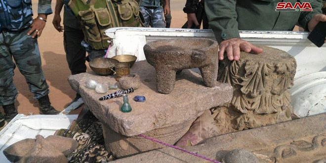 يشار إلى أن المجموعات الإرهابية في درعا عمدت خلال السنوات الماضية إلى تهريب آلاف القطع الأثرية والمنحوتات التي تعود أعمارها إلى آلاف السنين إلى خارج سورية عبر الحدود الأردنية إضافة إلى قيامها بتدمير وتخريب العديد من اللقى والمنحوتات الأثرية والتنقيب غير الشرعي في المواقع الأثرية.