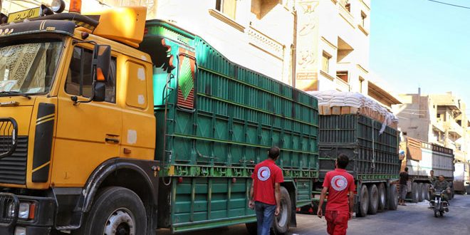 أوصلت منظمة الهلال الأحمر العربي السوري قافلة مساعدات إنسانية مؤلفة من 20 شاحنة محملة مواد إغاثية غذائية إلى الأهالي العائدين إلى ريف دير الزور.