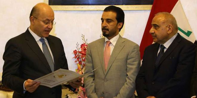 وكان مجلس النواب العراقي انتخب في وقت سابق اليوم برهم صالح رئيسا للجمهورية بعد تقدمه على فؤاد حسين خلال جولة ثانية عقب إخفاق أي من المرشحين في الحصول على ثلثي أصوات النواب في الجولة الأولى.