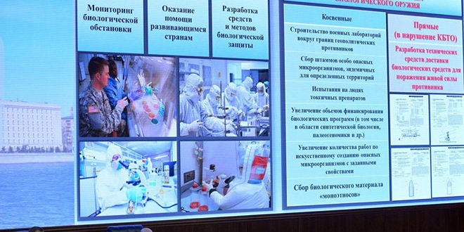 وأوضحت الوزارة في مؤتمر صحفي لها اليوم أن وزارة الدفاع الأمريكية “البنتاغون” “نشرت مختبرات بيولوجية محظورة في دول قريبة من الحدود الروسية والصينية”، مشيرة إلى أن المختبرات غير شرعية وتعمل تحت غطاء مؤسسات طبية مدنية وتقوم بإجراء تجاربها على المدنيين.