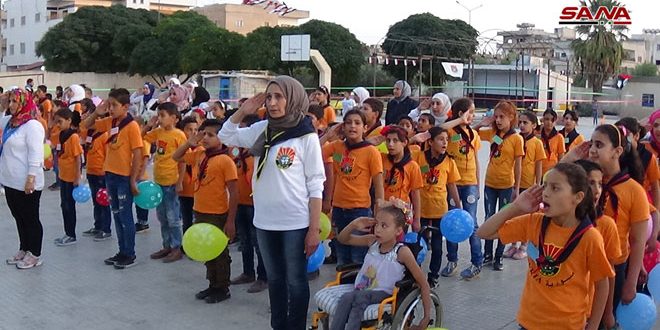 وبين نايف حسين قائد المخيم أن عدد الأطفال المشاركين في المخيم مئة طفل وطفلة من أبناء وبنات الشهداء العسكريين والمدنيين في محافظة درعا لافتا إلى أن فعاليات المخيم تتضمن أنشطة وفعاليات ترفيهية متعددة من موسيقا وغناء ورسم وفقرات رياضية متنوعة بهدف تكريس قيم العمل الجماعي وترسيخ المحبة بين الأطفال.