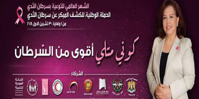 يذكر أن الحملة الوطنية للكشف المبكر عن سرطان الثدي انطلقت بداية تشرين الأول الجارى تزامنا مع شهر التوعية العالمى بالمرض عبر 132 مركزا صحيا ومجتمعيا تتبع لوزارات الصحة والتعليم العالي والدفاع والداخلية وجمعية تنظيم الأسرة ومنظمة الهلال الأحمر العربي السوري.