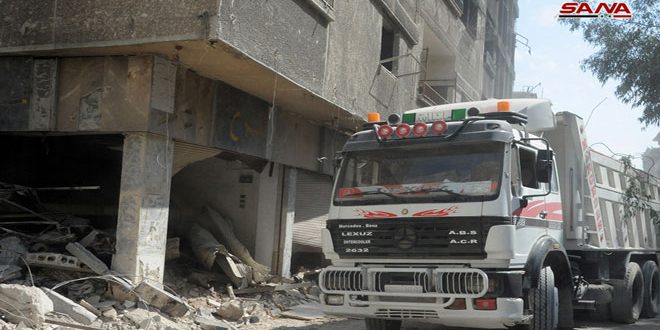 تواصل الجرافات والآليات عملها في إزالة الأنقاض وتنظيف شوارع مخيم اليرموك جنوب دمشق في إطار خطة متكاملة من عدة مراحل لإعادة تأهيل وإصلاح ما خربته التنظيمات الإرهابية التكفيرية التي دحرها الجيش العربي السوري عن المخيم في أيار الماضي.