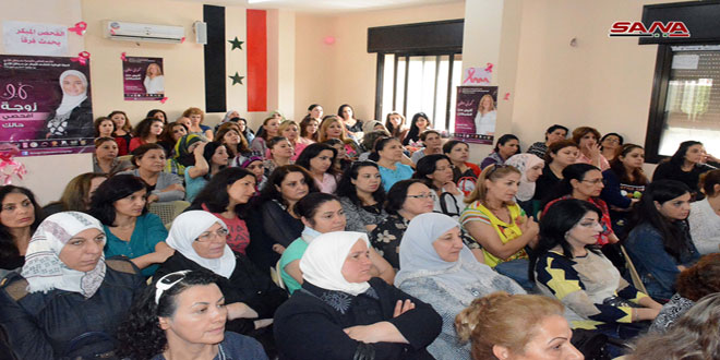 ضمن الحملة الوطنية للكشف المبكر عن سرطان الثدي التي تتزامن مع الشهر العالمي للتوعية بهذا المرض أقام اتحاد عمال محافظة حمص بالتعاون مع مديرية الصحة محاضرة على مسرح النادي العمالي اليوم حول أهمية الكشف المبكر عن المرض وسبل الوقاية منه.