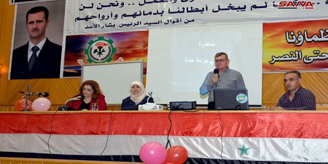 ضمن فعاليات الحملة الوطنية للكشف المبكر عن سرطان الثدي التي تتزامن مع الشهر العالمي للتوعية بهذا المرض نظمت مديرية صحة حماة بالتعاون مع اتحاد عمال المحافظة اليوم ندوة توعوية في صالة الاتحاد حول أهمية الكشف المبكر عن المرض.