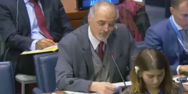 وأكد الجعفري في ختام بيانه على أن الإرهاب سيرتد على داعميه ومموليه وقال:”إن الإرهاب الذي تدعمه وترعاه وتزوده بالمواد الكيميائية السامة سيرتد عاجلاً أم آجلاً على حكومات تلك الدول التي تمول الإرهاب وعلى الدول الأخرى” داعيا الدول الأعضاء إلى تحمل مسؤولياتها بوقف تهريب الأسلحة والذخائر بكل فئاتها والمواد ذات الصلة سواء كانت “قاتلة أم غير قاتلة” ووقف تهريب المسلحين والإرهابيين عبر حدود الدول المجاورة لبلادي سورية.