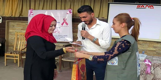 نفذت جمعية شام الخير الخيرية في مدينة القامشلي بالحسكة اليوم نشاطات توعوية منوعة بحضور عدد من النساء وذلك ضمن فعاليات الحملة الوطنية للكشف المبكر عن سرطان الثدي والتي تأتي بالتزامن مع الشهر العالمي للتوعية بهذا المرض.