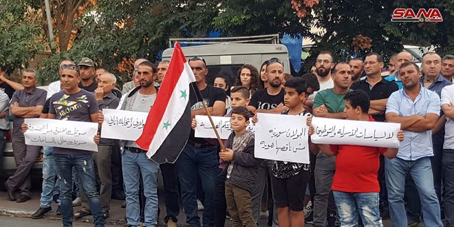 بدوره قال ايميل مسعود من أبناء الجولان المحتل لم ولن نقبل بأي إجراءات عنصرية إسرائيلية من شأنها المس بهوية الجولان العربي السوري أرضا وسكانا وتاريخا مؤكدا ان الجولان سيبقى عربيا سوريا رغم انف الاحتلال وداعميه.