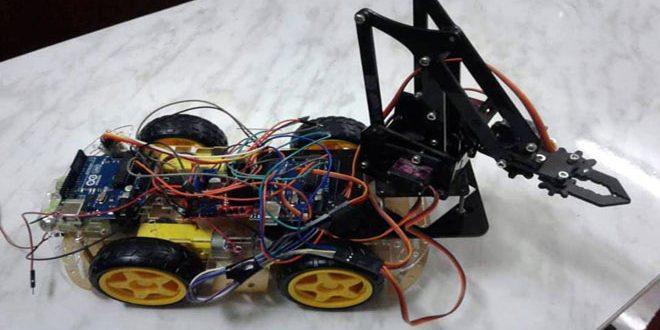 دراسة وتنفيذ ذراع آلية مثبتة على عربة متحركة لمساعدة مهنيي الصيانة في عملهم هي فكرة المشروع الذي قدمه الطلاب عبدالرزاق ابراهيم ويزن الحايك وملك فيتروني من قسم هندسة التحكم الآلي والحواسيب في كلية الهندسة الميكانيكية والكهربائية بجامعة البعث ضمن فعاليات (معرض الباسل للإبداع والاختراع) في نسخته الأخيرة.