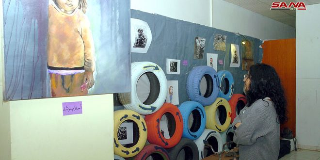 الفنانة التشكيلية إيمان الحمود التي تشارك بلوحتين اشتغلتهما بالزيتي جسدت واقع الأطفال والمشردين منهم واستغلالهم ولا سيما في ظل ظروف الحرب على سورية وهو ما سلطت الضوء عليه أيضا الفنانة التشكيلية مروة الحكيم من خلال لوحة لطفل يعمل بائعا متجولا بأسلوب واقعي كلاسيكي في الوقت الذي نقل الفنان التشكيلي مهران أبو كرم بلوحته ما يختلج داخل طفلة من مشاعر غضب وكره تحملها نظراتها بأسلوب واقعي.