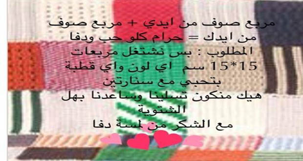 اطلقت مبادرة لمسة دفا حملة تطوعية بعنوان مربع صوف لتوزيع عدد من الأغطية الشتوية المشغولة يدوياً من قبل عدد كبير من الشابات على المحتاجين لتقيهم برد الشتاء.