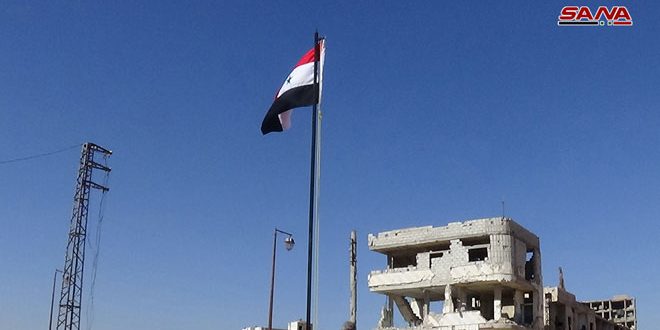 بدوره قال حسن طباشة أحد سكان المخيم: بكل فخر واعتزاز نرفع علم الوطن على مخيم النازحين ونوجه التحية للجيش العربي السوري لافتا إلى أن أبناء المخيم عازمون على إعادة تأهيله ونفض غبار الإرهاب عنه.