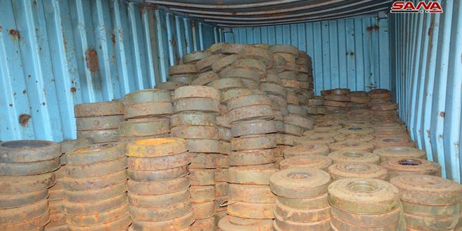 وذكر مراسل سانا في القنيطرة أن الجهات المختصة عثرت خلال أعمال التمشيط المتواصلة لتطهير المناطق المحررة من الإرهاب على مستودع تحت الأرض يحتوي على كميات كبيرة من الألغام المضادة للدروع في قرية بريقة في أقصى الريف الغربي.