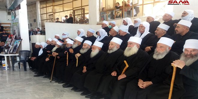 ونوه المشاركون بالبطولات والتضحيات التي قدمها أبطال الجيش العربي السوري والقوات الرديفة لدحر الإرهابيين، وأن مشروع “إسرائيل” بالتواطؤ مع الإرهابيين من تنظيم جبهة النصرة لإقامة منطقة عازلة على مشارف الجولان المحتل باء بالفشل وسقط تحت أقدام حماة الديار والشرفاء من رجالات منطقة جبل الشيخ ومحافظة القنيطرة والسويداء وريف دمشق.