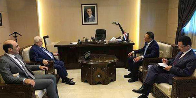 استقبل وليد المعلم نائب رئيس مجلس الوزراء وزير الخارجية والمغتربين صباح اليوم كلا على حدة فونغ بياو سفير جمهورية الصين الشعبية وميغيل بورتو بارغا سفير جمهورية كوبا وتسلم منهما نسخة من أوراق اعتمادهما سفيرين مفوضين فوق العادة لجمهورية الصين الشعبية وجمهورية كوبا لدى الجمهورية العربية السورية.