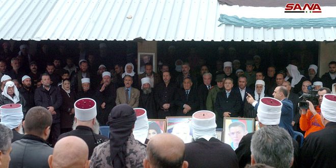 بتكليف من السيد الرئيس بشار الأسد قدم وزير شؤون رئاسة الجمهورية منصور عزام التعازي لذوي الشهداء الذين ارتقوا اثناء خطفهم لدى تنظيم “داعش” الإرهابي وذلك خلال مجلس تشييع وتأبين جرى في قريتهم الشبكي بريف السويداء الشرقي.