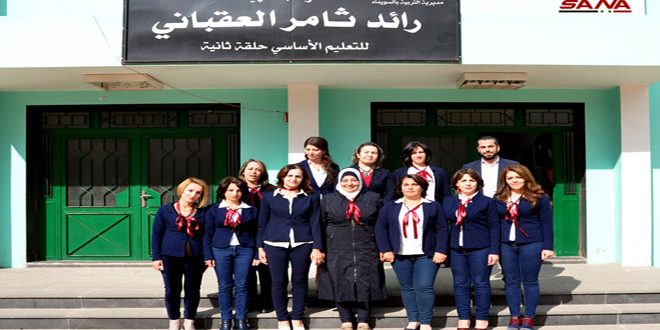 تجربة جديدة للباس الموحد للمدرسين طبقتها خلال العام الدراسي الحالي إدارة مدرسة الشهيد رائد ثامر العقباني في بلدة قنوات بمحافظة السويداء للتعليم الأساسي الحلقة الثانية.