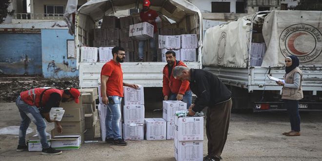 ووزعت فرق الهلال الأحمر العربي السوري امس مساعدات غذائية لـ 400 عائلة في بلدة نامر في الريف الشمالي الشرقي.