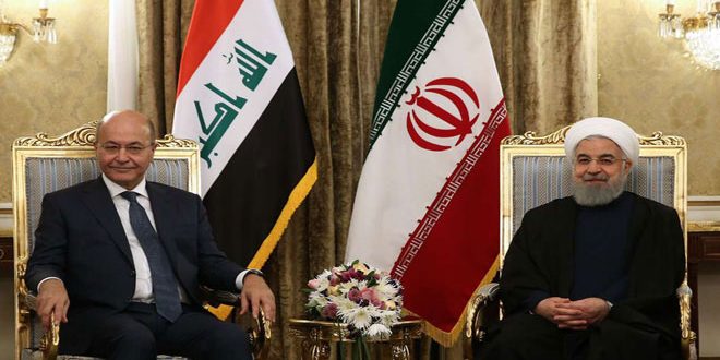 بحث الرئيسان الإيراني حسن روحاني والعراقي برهم صالح في طهران اليوم سبل تعزيز العلاقات الثنائية بين البلدين وتحقيق الاستقرار في المنطقة ومنع التدخلات الأجنبية في شؤونها.