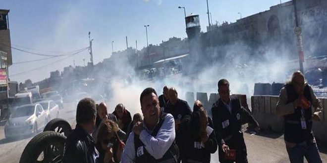 وأصيب عشرات الصحفيين الفلسطينيين والأجانب بحالات اختناق أمس جراء قمع قوات الاحتلال الإسرائيلي مسيرة نظمها الاتحاد الدولي للصحفيين فى بلدة قلنديا شمال القدس المحتلة للمطالبة بوقف انتهاكات الاحتلال بحقهم.