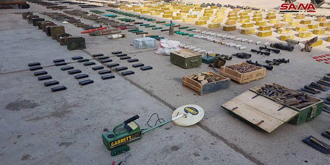 وذكر مراسل سانا في حمص أن الجهات المختصة ضبطت خلال استكمال أعمال تمشيط وتأمين ما تبقى من مزارع وتجمعات سكانية بريف حمص الشمالي أوكارا من مخلفات الإرهابيين فيها كميات من الأسلحة والذخائر بينها بنادق حربية أمريكية الصنع.