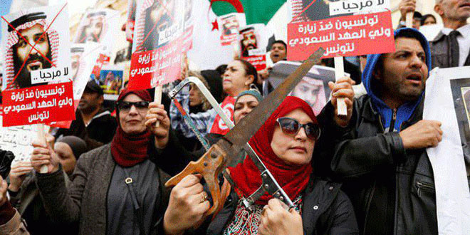 وذكرت رويترز أن مئات التونسيين احتشدوا فى شارع الحبيب بورقيبة الرئيسي في العاصمة تونس رافعين لافتات تندد بزيارة ابن سلمان وصورا يظهر فيها ويداه ملطختان بالدماء وأخرى فى يده منشار كتب عليها “عار عار استقبال أبو منشار” في إشارة إلى قتل الصحفي السعودي جمال خاشقجي في القنصلية السعودية باسطنبول الشهر الماضي.