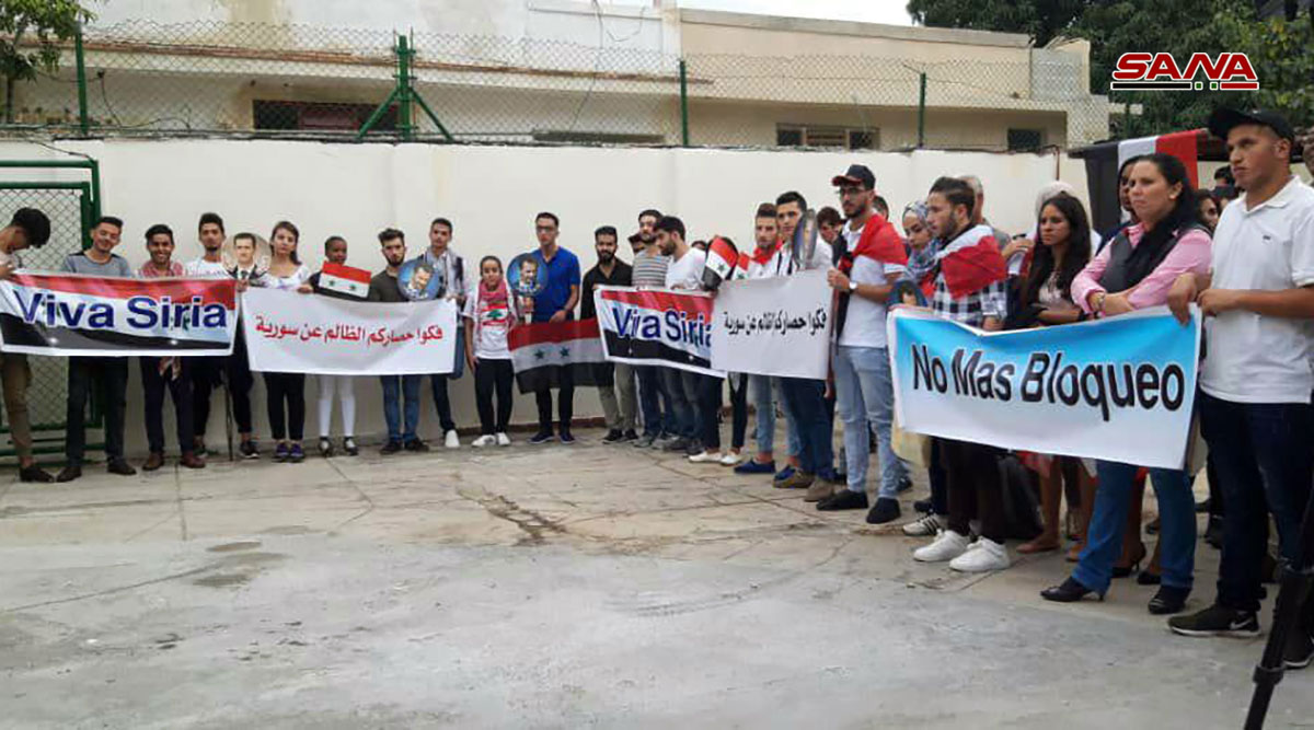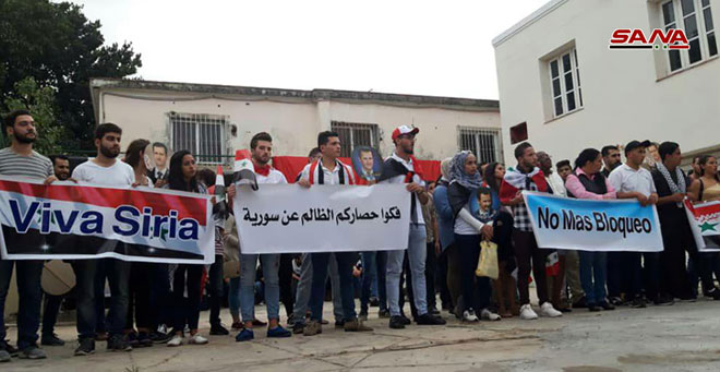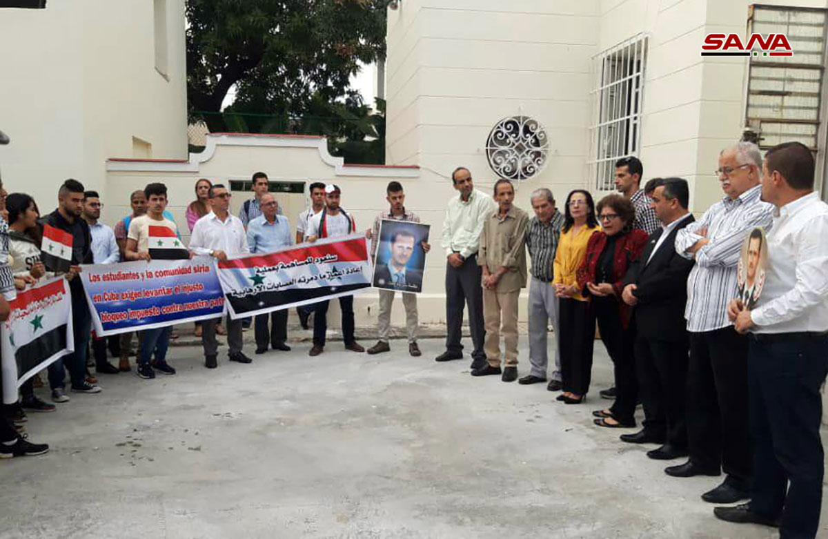 وفي هافانا أقام فرع كوبا للاتحاد الوطني لطلبة سورية بالتعاون مع السفارة السورية والجالية فعالية للتنديد بالإجراءات القسرية الغربية أحادية الجانب على سورية رفع المشاركون خلالها لافتات باللغتين العربية والإسبانية تندد بالحصار الظالم على سورية وتطالب بضرورة إنهائه وبمحاربة الإرهاب.