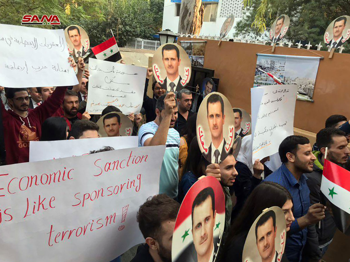 وقال وليم المعلم رئيس الاتحاد الوطني لطلبة سورية فرع مصر في كلمة خلال الوقفة الاحتجاجية التي أقيمت داخل البعثة القنصلية السورية في القاهرة: “تأتي وقفتنا اليوم لندعو إلى فك الحصار الظالم الذي تفرضه دول الاتحاد الأوروبي ومن حذا حذوها عن شعبنا السوري الصامد” مؤكدا أن التدخل الذي تمارسه هذه الدول في الشؤون الاقتصادية والداخلية لسورية واستخدام الحصار الاقتصادي على الشعب السوري ليس إلا فنا من فنون الحرب وأخطر من جرائم التنظيمات الإرهابية في الداخل.