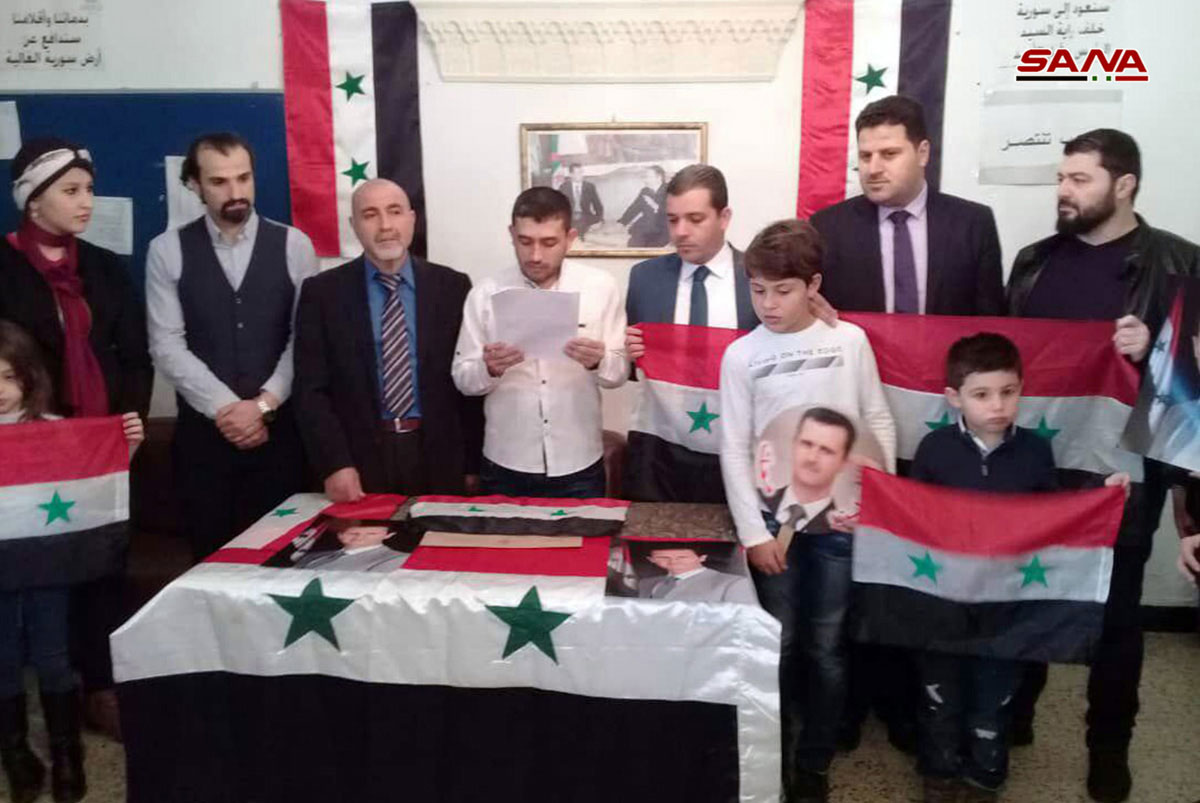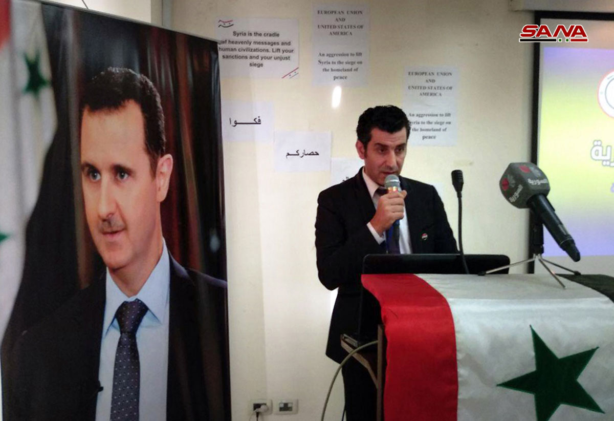 من جهته شدد الدكتور رياض سنيح رئيس البعثة القنصلية السورية على أنه رغم الحصار فإن سورية صامدة منتصرة مبينا أن هناك دولا غربية تقف ضد سورية وتتآمر عليها ونقول لهم: “أوقفوا إرهابكم ودعمكم له”.