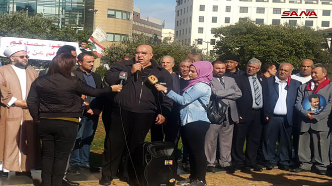 من جهته أكد رئيس رابطة العمال السوريين في لبنان مصطفى منصور أن هذه الوقفة تأتي رفضا للحصار الجائر والظالم الذي تتعرض له سورية من قبل الدول الغربية الداعمة للإرهاب بكل أشكاله ومسمياته والتي تحاول فرض مخططات التفتيت والتجزئة وتشتيت قدرات النهوض والتنمية خدمة للمشروع الصهيوني الإمبريالي في الهيمنة المطلقة على هذه المنطقة من العالم مجددا وقوف العمال إلى جانب وطنهم وشعبهم في مواجهة ما يتعرض له من مؤامرات.