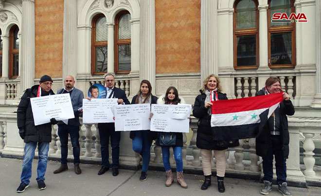 وأشار الطلبة وأبناء الجالية خلال وقفة احتجاجية أمام مبنى المفوضية الأوروبية في فيينا إلى استمرار الدولة السورية بجميع مؤسساتها في القيام بواجباتها بكل ما من شأنه تخفيف معاناة مواطنيها جراء الجرائم والممارسات غير الإنسانية التي ترتكبها التنظيمات الإرهابية مطالبين بإنهاء الحصار الاقتصادي ورفع الإجراءات الاقتصادية الظالمة عن وطنهم سورية.