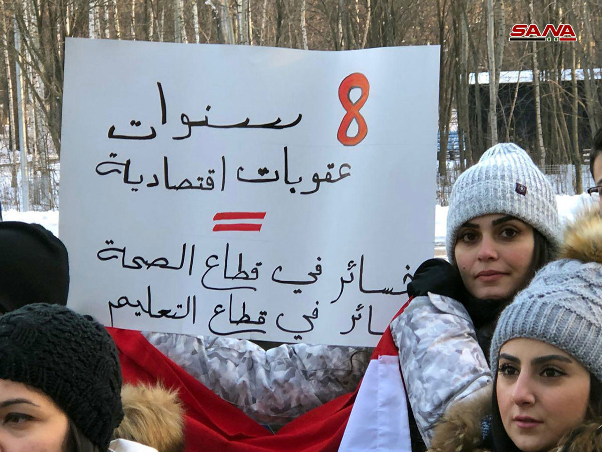 ورفع المشاركون لافتات باللغات العربية والروسية والإنكليزية تقول: “إرفعوا أيديكم وحصاركم عن سورية.. ثماني سنوات من العقوبات الاقتصادية على سورية التي تحارب الإرهاب بدلا عن العالم.. العقوبات على سورية تساوى دعم الإرهاب الدولي”.