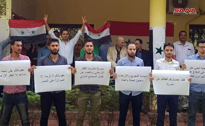 وفي كلمة له خلال الوقفة الاحتجاجية أكد رئيس فرع الاتحاد الوطني لطلبة سورية رمضان موسى فخر واعتزاز الطلبة بإنجازات وانتصارات الجيش العربي السوري الباسل الذي أثبت أنه أقوى من كل المؤامرات التي حيكت وتحاك ضد سورية.