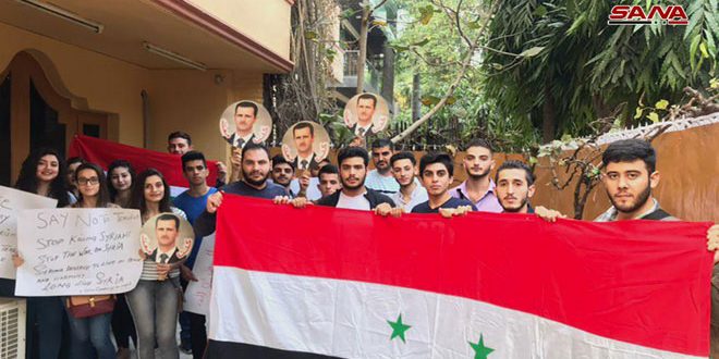 وحمل المشاركون بالوقفة الاحتجاجية التي نظمها فرع الاتحاد الوطني لطلبة سورية في الهند لافتات وعلم سورية الوطني ووجهوا التحية لأبطال الجيش العربي السوري البواسل وتضحياتهم في التصدي للإرهاب .