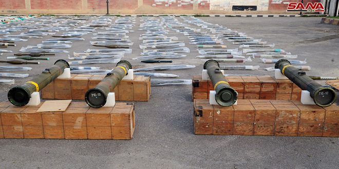 وعثرت الجهات المختصة الإثنين الماضي على كميات كبيرة من الأسلحة والذخائر من بينها صواريخ محمولة على الكتف مضادة للدروع ومدفع مزدوج كهربائي ومدافع بي 9 وأجهزة اتصال لاسلكية فضائية من مخلفات التنظيمات الإرهابية في الغوطة الشرقية وأرياف درعا والقنيطرة وحمص.