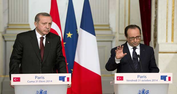 وقال هولاند في مؤتمر صحفي مع شريكه بدعم الإرهاب في سورية رئيس النظام التركي رجب طيب أردوغان في باريس اليوم: “إننا تطرقنا إلى هذا الوضع مع أردوغان ونحن متأكدون من أن الفوز على تنظيم داعش لن يتحقق إلا إذا كان هناك تعاون وثيق وفعلي وذلك من خلال المعارضة المعتدلة والدعم الذي يقدم إليها ولذلك فكرنا في كيفية تأمين هذا الدعم في إطار التحالف الدولي”.