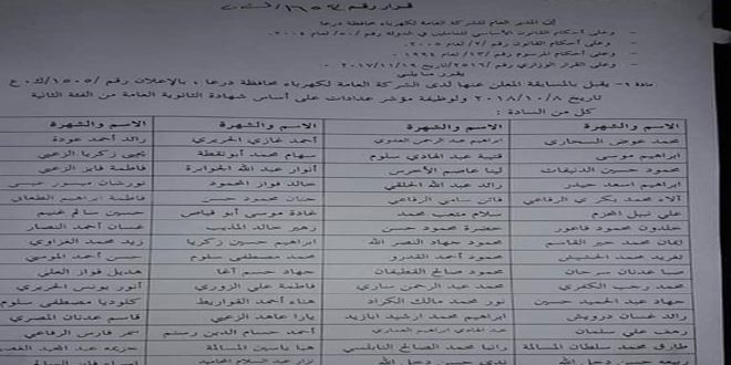 أعلنت الشركة العامة لكهرباء درعا اليوم أسماء المقبولين للتقدم إلى مسابقة واختبار تعيين موظفين بصفة مؤشر كهرباء.