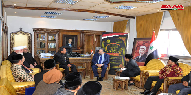 بحث وزير الأوقاف الدكتور محمد عبد الستار السيد خلال لقائه اليوم الوفد الديني الإندونيسي برئاسة رئيس مجلس علماء إندونيسيا إيمان براسيتوموليادي تعميق علاقات التعاون القائمة بين سورية وإندونيسيا في المجال الديني وآفاق تطويره.