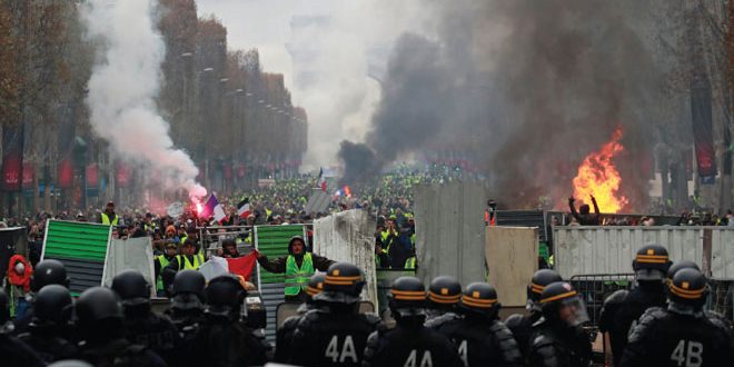 وتشهد مختلف المناطق الفرنسية منذ السابع عشر من الشهر الماضي احتجاجات شعبية ضخمة شارك فيها عشرات آلالاف ممن أصبح يطلق عليهم حركة “السترات الصفراء” ضد رفع أسعار الوقود وزيادة الضرائب ورفع تكاليف المعيشة فيما اضطر ماكرون على خلفية حالة الغليان الشعبي تجاه سياساته الاقتصادية الفاشلة إلى إلغاء الضرائب على الوقود لامتصاص النقمة الشعبية المتزايدة في البلاد.